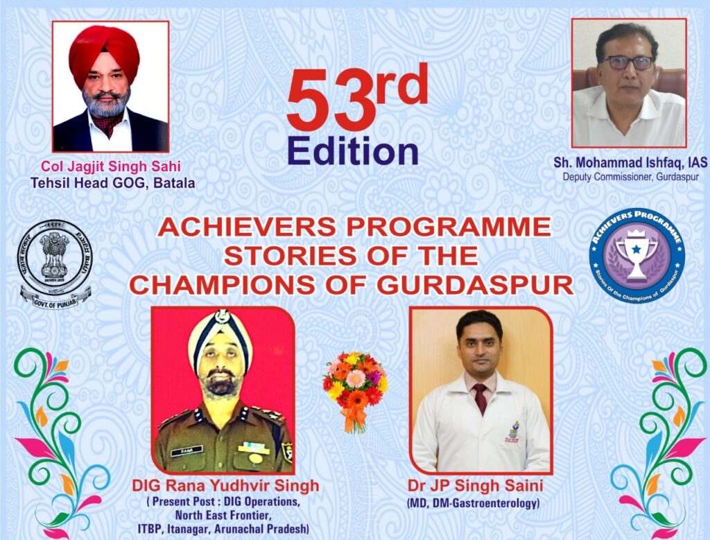 ਇਸ ਮੌਕੇ ਪਹਿਲੇ ਅਚੀਵਰਜ਼ ਡੀ.ਆਈ.ਜੀ, ਰਾਣਾ ਯੁੱਧਵੀਰ ਸਿੰਘ, ਜੋ ਗੁਰਦਾਸਪੁਰ ਦੇ ਵਸਨੀਕ ਹਨ ਨੇ ਦੱਸਿਆ ਕਿ ਉਨਾਂ ਮੁੱਢਲੀ ਸਿੱਖਿਆ ਸ਼ਕਰਗੜ੍ਹ ਡੀਈਵੀ ਸਕੂਲ ਗੁਰਦਾਸਪੁਰ, ਸੈਨਿਕ ਸਕੂਲ ਕਪੂਰਥਲਾ ਤੋਂ ਕਰਨ ਉਪਰੰਤ ਉਚੇਰੀ ਸਿੱਖਿਆ ਗੁਰੂ ਨਾਨਕ ਦੇਵ ਯੂਨੀਵਰਸਿਟੀ ਸ੍ਰੀ ਅੰਮਿ੍ਰਤਸਰ ਤੋਂ ਗ੍ਰਹਿਣ ਕੀਤੀ। ਉਪਰੰਤ ਇੰਡੀਅਨ ਸਕੂਲ ਆਫ ਬਿਜ਼ਨਲ, ਮੁਹਾਲੀ ਤੋਂ ਮੈਨਜੈਮੈਂਟ ਪ੍ਰੋਗਰਾਮ ਇੰਨ ਪਬਲਿਕ ਪਾਲਿਸੀ ਦੀ ਡਿਗਰੀ ਪਾਸ ਕੀਤੀ। ਉਪਰੰਤ 1992 ਵਿਚ ਆਈ.ਟੀ.ਬੀ.ਪੀ (ITBP) ਵਿਚ (DAGO-Directoly Appointed Gazetted Officer) ਜੁਆਇੰਨ ਕੀਤਾ। ਹੁਣ ਡੀ.ਆਈ.ਜੀ (ਆਪਰੇਸ਼ਨ) ਨਾਰਥ-ਈਸਟ ਫਰੰਟੀਅਰ, ਆਈ.ਟੀ.ਬੀ.ਪੀ, ਈਟਾਨਗਰ, ਅਰੁਣਾਚਲ ਪ੍ਰਦੇਸ਼ ਵਿਖੇ ਸੇਵਾਵਾਂ ਨਿਭਾ ਰਹੇ ਹਨ। ਉਨਾਂ ਡਿਪਟੀ ਕਮਿਸ਼ਨਰ ਵਲੋਂ ਸ਼ੁਰੂ ਕੀਤੇ ਗਏ ਅਚੀਵਰਜ ਪ੍ਰੋਗਰਾਮ ਦੀ ਸਰਾਹਨਾ ਕਰਦਿਆਂ ਕਿਹਾ ਕਿ ਇਹ ਆਪਣੇ ਆਪ ਵਿਚ ਨਿਵੇਕਲਾ ਤੇ ਸ਼ਾਨਦਾਰ ਉਪਰਾਲਾ ਹੈ , ਜੋ ਜ਼ਿਲਾ ਵਾਸੀਆਂ ਲਈ ਕੀਮਤੀ ਸੌਗਾਤ ਹੈ। ਉਨਾਂ ਵਿਦਿਆਰਥੀਆਂ ਨੂੰ ਸੰਬੋਧਨ ਕਰਦਿਆਂ ਕਿਹਾ ਕਿ ਜੇਕਰ ਦਿਨ ਦੀ ਸ਼ੁਰੂਆਤ ਵਧੀਆ ਹੋਵੇ ਤਾਂ ਸਾਰਾ ਦਿਨ ਵਧੀਆ ਰਹਿੰਦਾ ਹੈ। ਉਨਾਂ ਦੱਸਿਆ ਕਿ ਕਿਸੇ ਵੀ ਤਰਾਂ ਦੀ ਟਰੇਨਿੰਗ ਦੇ ਤਿੰਨ ਮੁੱਖ ਪਹਿਲੂ ਹੁੰਦੇ ਹਨ, ਆਪਣੀ ਸਵੇਰ ਦੀ ਰੁਟੀਨ ਵਿਚ ਇਕ ਡਾਇਰੀ ਜਰੂਰ ਲਿਖੋ ਅਤੇ ਜੋ ਵਿਚਾਰ ਤੁਹਾਡੇ ਮਨ ਵਿਚ ਆਉਂਦੇ ਹਨ, ਉਸਨੂੰ ਲਿਖੋ, ਪਰਮਾਤਮਾ ਨੂੰ ਯਾਦ ਕਰੋ ਤੇ ਕਸਰਤ ਕਰੋ ਅਤੇ ਸਿਲੇਬਸ ਤੋਂ ਇਲਾਵਾ ਚੰਗੀਆਂ ਕਿਤਾਬਾਂ ਪੜ੍ਹੋ। ਅਸਫਲਤਾ ਤੋਂ ਨਾ ਘਬਰਾਓ ਅਤੇ ਆਪਣੇ ਸੁਪਨੇ ਪੂਰੇ ਕਰਨ ਲਈ ਪੂਰੀ ਮਿਹਨਤ ਤੇ ਲਗਨ ਨਾਲ ਕੰਮ ਕਰੋ। ਉਨਾਂ ‘ਮੈਂਟਰਸ਼ਿਪ’ ਪ੍ਰੋਗਰਾਮ ਸ਼ੁਰੂ ਕਰਨ ਦਾ ਸੁਝਾਅ ਦਿੰਦਿਆਂ ਕਿਹਾ ਕਿ ਇਸ ਨਾਲ ਬੱਚਿਆਂ ਨੂੰ ਬਹੁਤ ਲਾਭ ਮਿਲੇਗਾ।