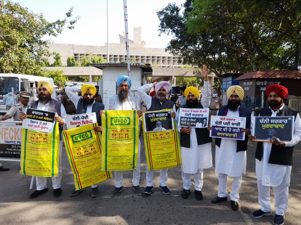 ਹੱਥਾਂ ਵਿੱਚ ਚੰਨੀ ਅਤੇ ਮੋਦੀ ਸਰਕਾਰ ਖਿਲਾਫ਼ ਤਖ਼ਤੀਆਂ ਅਤੇ ਡੀ.ਏ.ਪੀ. ਖਾਦ ਦੇ ਖਾਲੀ ਥੈਲੇ ਫੜ ਕੇ ‘ਆਪ’ ਵਿਧਾਇਕਾਂ ਨੇ ਜਿੱਥੇ ਕੇਂਦਰ ਦੀ ਮੋਦੀ ਸਰਕਾਰ ਉਤੇ ਪੰਜਾਬ ਦੇ ਕਿਸਾਨਾਂ ਨਾਲ ਮਤਰੇਈ ਮਾਂ ਵਾਲਾ ਸਲੂਕ ਕਰਨ ਦੇ ਦੋਸ਼ ਲਾਏ, ਉਥੇ ਮੁੱਖ ਮੰਤਰੀ ਚਰਨਜੀਤ ਸਿੰਘ ਚੰਨੀ ਨੂੰ ਹੁਣ ਤੱਕ ਦਾ ਸਭ ਤੋਂ ਕਮਜ਼ੋਰ ਮੁੱਖ ਮੰਤਰੀ ਕਰਾਰ ਦਿੱਤਾ ਅਤੇ ਦੋਸ਼ ਲਾਇਆ ਕਿ ਚੰਨੀ ਨੇ ਕੁਰਸੀ ਅਤੇ ਕਮਜੋਰੀ ਕਾਰਨ ਕੇਂਦਰ ਦੀ ਮੋਦੀ ਸਰਕਾਰ ਮੂਹਰੇ ਆਤਮ ਸਮਰਪਣ ਕਰ ਦਿੱਤਾ ਹੈ।