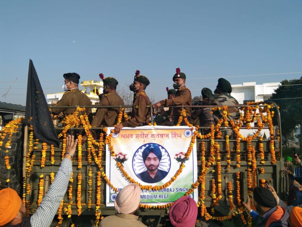 ਬਟਾਲਾ, 12 ਫਰਵਰੀ (ਮੰਨਣ ਸੈਣੀ) – ਅਰੁਣਾਚਲ ਪ੍ਰਦੇਸ਼ ਦੀ ਭਾਰਤ-ਚੀਨ ਸਰਹੱਦ ’ਤੇ ਭਾਰਤੀ ਫੌਜ ਦੇ ਜਵਾਨ ਗੁਰਬਾਜ ਸਿੰਘ ਜਿਸਦੀ ਬੀਤੇ ਦਿਨੀ ਬਰਫੀਲੇ ਤੂਫਾਨ ਦੀ ਚਪੇਟ ਵਿੱਚ ਆਉਣ ਕਾਰਨ ਸ਼ਹਾਦਤ ਹੋ ਗਈ ਸੀ ਦਾ ਅੱਜ ਪੂਰੇ ਸਰਕਾਰੀ ਸਨਮਾਨਾਂ ਨਾਲ ਅੰਤਿਮ ਸਸਕਾਰ ਉਸਦੇ ਪਿੰਡ ਮਸਾਣੀਆਂ ਵਿਖੇ ਕਰ ਦਿੱਤਾ ਗਿਆ। ਅੱਜ ਬਾਅਦ ਦੁਪਹਿਰ ਜਦੋਂ ਸ਼ਹੀਦ ਗੁਰਬਾਜ ਸਿੰਘ ਦੀ ਦੇਹ ਪਿੰਡ ਮਸਾਣੀਆਂ ਪਹੁੰਚੀ ਤਾਂ ਪਿੰਡ ਦੇ ਨੌਜਵਾਨਾਂ ਨੇ ‘ਸ਼ਹੀਦ ਗੁਰਬਾਜ ਸਿੰਘ ਅਮਰ ਰਹੇ’ ਦੇ ਅਕਾਸ਼ ਗੂੰਜਾਊ ਨਾਹਰੇ ਲਗਾਏ।