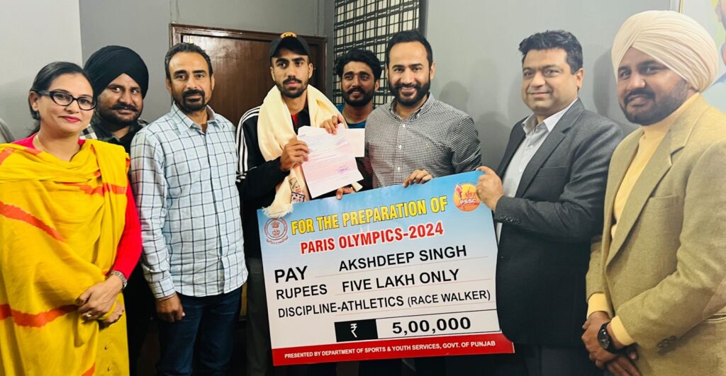 ਚੰਡੀਗੜ੍ਹ, 18 ਫਰਵਰੀ 2023 (ਦੀ ਪੰਜਾਬ ਵਾਇਰ)। ਪੰਜਾਬ ਦੇ ਖੇਡ ਮੰਤਰੀ ਗੁਰਮੀਤ ਸਿੰਘ ਮੀਤ ਹੇਅਰ ਨੇ ਰਾਂਚੀ ਵਿਖੇ 20 ਕਿਲੋ ਮੀਟਰ ਪੈਦਲ ਤੋਰ ਵਿੱਚ ਨਵੇਂ ਨੈਸ਼ਨਲ ਰਿਕਾਰਡ ਨਾਲ ਓਲੰਪਿਕ ਤੇ ਏਸ਼ਿਆਈ ਖੇਡਾਂ ਅਤੇ ਵਿਸ਼ਵ ਚੈਂਪੀਅਨਸ਼ਿਪ ਲਈ ਕੁਆਲੀਫਾਈ ਹੋਏ ਅਥਲੀਟ ਅਕਸ਼ਦੀਪ ਸਿੰਘ ਨੂੰ ਪੈਰਿਸ ਓਲੰਪਿਕਸ ਦੀ ਤਿਆਰੀ ਲਈ 5 ਲੱਖ ਰੁਪਏ ਦਾ ਚੈੱਕ ਸੌਂਪਿਆ। ਖੇਡ ਮੰਤਰੀ ਨੇ ਇੱਥੇ ਚੰਡੀਗੜ੍ਹ ਸਥਿਤ ਆਪਣੀ ਰਿਹਾਇਸ਼ ਵਿਖੇ ਅਕਸ਼ਦੀਪ ਸਿੰਘ ਨਾਲ ਮੁਲਾਕਾਤ ਕਰਕੇ ਉਸ ਦਾ ਸਨਮਾਨ ਕਰਦਿਆਂ ਇਹ ਚੈੱਕ ਸੌਂਪਿਆ।