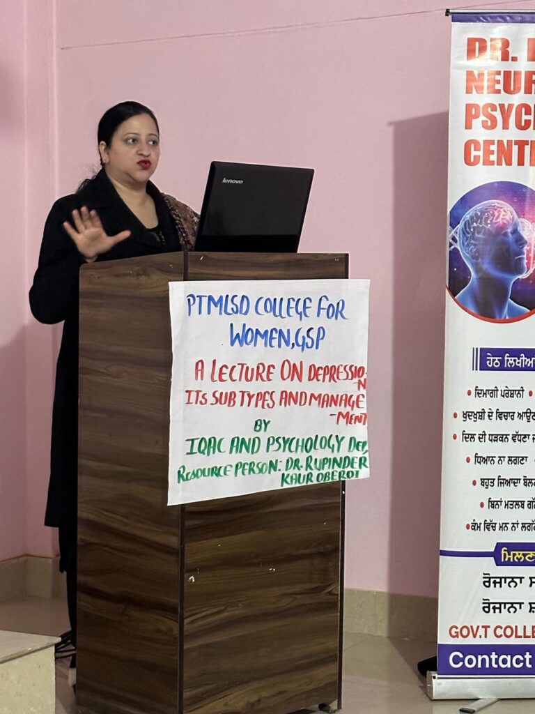 ਗੁਰਦਾਸਪੁਰ, 29 ਜਨਵਰੀ 2024 (ਦੀ ਪੰਜਾਬ ਵਾਇਰ)। ਡਾ ਰੁਪਿੰਦਰ ਨਿਓਰੋਸਾਇਕੈਟ੍ਰੀ ਸੈਂਟਰ ਦੀ ਡਾਕਟਰ ਰੁਪਿੰਦਰ ਓਬਰਾਏ ਵੱਲੋਂ ਬੀਤੇ ਦਿਨ੍ਹੀਂ ਪੰਡਿਤ ਮੋਹਨ ਲਾਲ ਐਸਡੀ ਕਾਲੇਜ ਫਾਰ ਵੂਮੇਂਨ ਵੱਲੋਂ ਡਿਪ੍ਰੈਸ਼ਨ ਨੂੰ ਸਮਝਣ ਸਬੰਧੀ ਕਰਵਾਏ ਗਏ ਸੈਮੀਨਾਰ ਵਿੱਚ ਮਨੋਵਿਗਿਆਨ ਦੇ ਵਿਦਿਆਰਥੀਆਂ ਨੂੰ ਲੈਕਚਰ ਦਿੱਤਾ ਗਿਆ। ਇਸ ਦੌਰਾਨ ਡਾ ਰੁਪਿੰਦਰ ਵੱਲੋਂ ਵਿਦਿਆਰਥੀਆਂ ਦੇ ਗਿਆਨ ਵਿੱਚ ਵਾਧਾ ਕਰਦੇ ਹੋਏ ਬੇਹਦ ਬਾਰੀਕੀ ਨਾਲ ਉਨ੍ਹਾਂ ਦੇ ਸ਼ੰਕੇ ਦੂਰ ਕੀਤੇ ਗਏ।