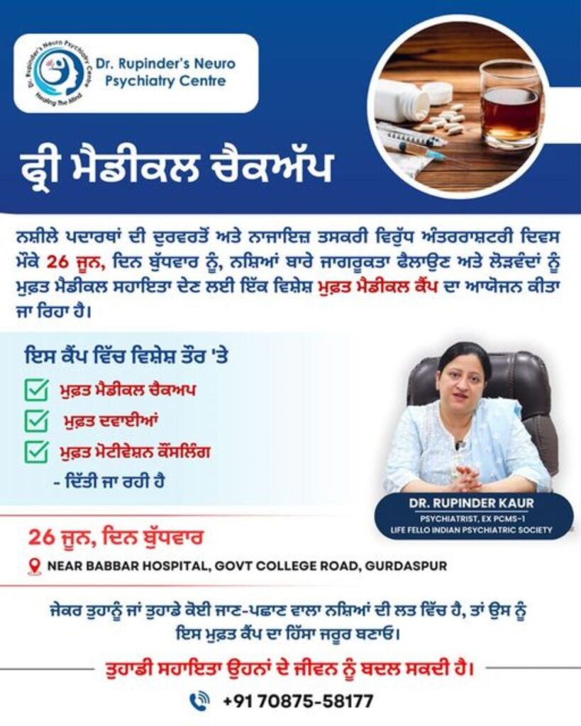 ਗੁਰਦਾਸਪੁਰ, 24 ਜੂਨ 2024 (ਦੀ ਪੰਜਾਬ ਵਾਇਰ)। ਨਸ਼ੀਲੇ ਪਦਾਰਥਾਂ ਦੀ ਦੁਰਵਰਤੋਂ ਅਤੇ ਨਾਜਾਇਜ਼ ਤਸਕਰੀ ਵਿਰੁੱਧ ਅੰਤਰਰਾਸ਼ਟਰੀ ਦਿਵਸ ਮੌਕੇ ਤੇ ਜਾਗਰੂਕਤਾ ਫੈਲਾਉਣ ਲਈ ਅਤੇ ਲੋੜਵੰਦਾਂ ਨੂੰ ਮੈਡੀਕਲ ਸਹਾਇਤਾ ਦੇਣ ਲਈ ਡਾ: ਰੁਪਿੰਦਰ ਨਿਓਰੋਸਾਇਕੈਟ੍ਰੀ ਸੈਂਟਰ ਤੇ ਵਿਸ਼ੇਸ਼ ਮੁਫ਼ਤ ਮੈਡੀਕਲ ਕੈਂਪ ਲਗਾਇਆ ਜਾ ਰਿਹਾ ਹੈ। ਇਹ ਮੈਡੀਕਲ ਕੈਂਪ 26 ਜੂਨ ਨੂੰ ਲਗਾਇਆ ਜਾ ਰਿਹਾ ਹੈ। ਇਸ ਕੈਂਪ ਵਿੱਚ ਪੰਜਾਬ ਹੈਲਥ ਸਿਸਟਮਜ਼ ਕਾਰਪੋਰੇਸ਼ਨ ਦੇ ਚੇਅਰਮੈਨ ਰਮਨ ਬਹਿਲ ਵੱਲੋਂ ਬਤੌਰ ਮੁੱਖ ਮਹਿਮਾਨ ਅਤੇ ਐਸਐਸਪੀ ਗੁਰਦਾਸਪੁਰ ਹਰੀਸ਼ ਦਾਯਮਾ ਵੱਲੋਂ ਬਤੌਰ ਗੈਸਟ ਆਫ਼ ਆਨਰ ਵਿਸ਼ੇਸ਼ ਰੂਪ ਵਿੱਚ ਸ਼ਿਰਕਤ ਕੀਤੀ ਜਾਵੇਗੀ