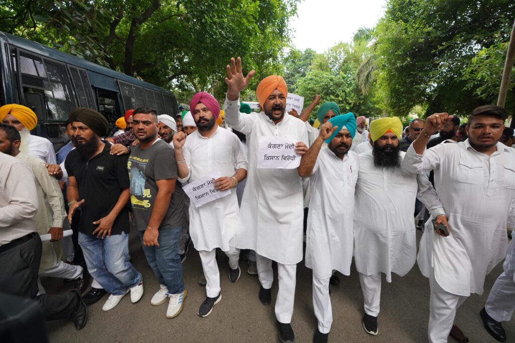 ਚੰਡੀਗੜ੍ਹ, 28 ਅਗਸਤ 2024 (ਦੀ ਪੰਜਾਬ ਵਾਇਰ)। ਆਮ ਆਦਮੀ ਪਾਰਟੀ (ਆਪ) ਪੰਜਾਬ ਦੇ ਆਗੂਆਂ ਨੇ ਬੁੱਧਵਾਰ ਨੂੰ ਚੰਡੀਗੜ੍ਹ ਸਥਿਤ ਭਾਜਪਾ ਦਫ਼ਤਰ ਦਾ ਘਿਰਾਓ ਕੀਤਾ ਅਤੇ ਭਾਜਪਾ ਆਗੂ ਕੰਗਨਾ ਰਣੌਤ ਦੇ ਕਿਸਾਨ ਵਿਰੋਧੀ ਰੁਖ਼ ਲਈ ਉਨ੍ਹਾਂ ਦੀ ਸਖ਼ਤ ਨਿੰਦਾ ਕੀਤੀ। ‘ਆਪ’ ਆਗੂਆਂ ਨੇ ਕਿਹਾ ਕਿ ਕੰਗਨਾ ਰਣੌਤ ਦਾ ਬਿਆਨ ਕੋਈ ਨਵਾਂ ਨਹੀਂ ਹੈ, ਸਗੋਂ ਇਹ ਭਾਰਤੀ ਜਨਤਾ ਪਾਰਟੀ ਦੀ ਵਿਚਾਰਧਾਰਾ ਹੈ।