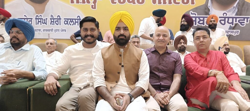 ਬਟਾਲਾ, ਗੁਰਦਾਸਪੁਰ, 29 ਜੂਨ 2025 (ਦੀ ਪੰਜਾਬ ਵਾਇਰ)— ਆਮ ਆਦਮੀ ਪਾਰਟੀ ਦੇ ਨਵ-ਨਿਯੁਕਤ ਜਿਲ੍ਹਾ ਗੁਰਦਾਸਪੁਰ ਦੇ ਪ੍ਰਧਾਨ ਜੋਬਨ ਰੰਧਾਵਾ ਦਾ ਅਹੁਦਾ ਸੰਭਾਲ ਸਮਾਰੋਹ ਅਤੇ ਪਲੇਠੀ ਜਿਲ੍ਹਾ ਵਰਕਰ ਮੀਟਿੰਗ ਬਟਾਲਾ ਵਿਖੇ ਕੀਤੀ ਗਈ, ਜਿਸ ਵਿਚ ਆਮ ਆਦਮੀ ਪਾਰਟੀ ਪੰਜਾਬ ਦੇ ਇੰਚਾਰਜ ਸ੍ਰੀ ਮਨੀਸ਼ ਸਿਸ਼ੋਦੀਆ, ਪੰਜਾਬ ਪ੍ਰਧਾਨ ਅਮਨ ਅਰੋੜਾ, ਪੰਜਾਬ ਦੇ ਕਾਰਜਕਾਰੀ ਪ੍ਰਧਾਨ ਅਤੇ ਬਟਾਲਾ ਦੇ ਵਿਧਾਇਕ ਅਮਨਸ਼ੇਰ ਸਿੰਘ ਸ਼ੈਰੀ ਕਲਸੀ ਅਤੇ ਕੈਬਨਿਟ ਮੰਤਰੀ ਕੁਲਦੀਪ ਸਿੰਘ ਧਾਲੀਵਾਲ ਨੇ ਮੁੱਖ ਤੌਰ ’ਤੇ ਸ਼ਿਰਕਤ ਕੀਤੀ।