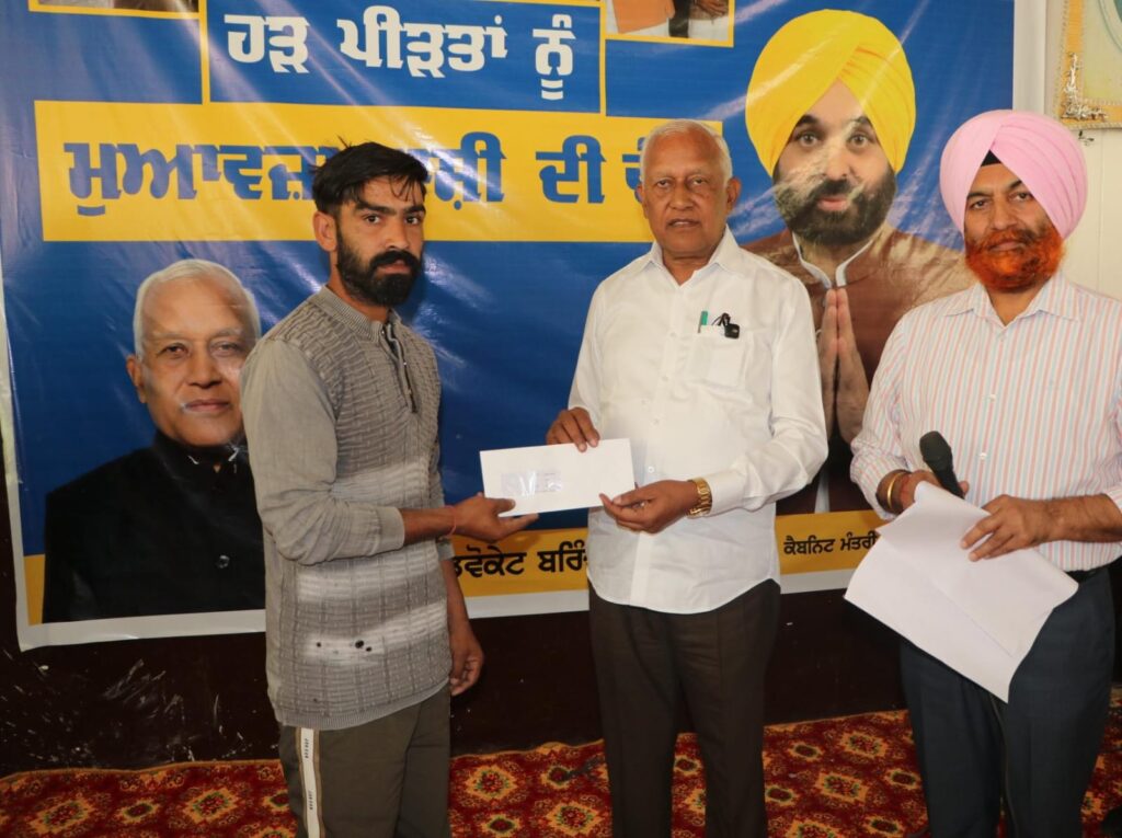 ਚੰਡੀਗੜ੍ਹ, 13 ਨਵੰਬਰ 2025 (ਦੀ ਪੰਜਾਬ ਵਾਇਰ)– ਮੁੱਖ ਮੰਤਰੀ ਭਗਵੰਤ ਸਿੰਘ ਮਾਨ ਦੀ ਗਤੀਸ਼ੀਲ ਅਗਵਾਈ ਹੇਠ ਲੋਕ ਭਲਾਈ ਅਤੇ ਆਰਥਿਕ ਸੁਰੱਖਿਆ ਨੂੰ ਯਕੀਨੀ ਬਣਾਉਣ ਪ੍ਰਤੀ ਪੰਜਾਬ ਸਰਕਾਰ ਦੀ ਵਚਨਬੱਧਤਾ ਨੂੰ ਦੁਹਰਾਉਂਦਿਆਂ ਕੈਬਨਿਟ ਮੰਤਰੀ ਬਰਿੰਦਰ ਕੁਮਾਰ ਗੋਇਲ ਨੇ ਅੱਜ ਲਹਿਰਾਗਾਗਾ ਵਿਖੇ ਕਰਵਾਏ ਗਏ ਵਿਸ਼ੇਸ਼ ਸਮਾਗਮ ਦੌਰਾਨ ਭਾਰੀ ਮੀਂਹ ਅਤੇ ਹੜ੍ਹਾਂ ਤੋਂ ਪ੍ਰਭਾਵਿਤ 280 ਵਸਨੀਕਾਂ ਨੂੰ ਮੁਆਵਜ਼ੇ ਵਜੋਂ 1.02 ਕਰੋੜ ਰੁਪਏ ਦੇ ਮਨਜ਼ੂਰੀ ਪੱਤਰ ਵੰਡੇ।