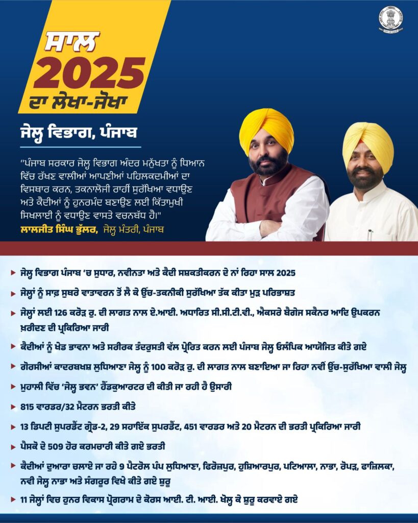 ਚੰਡੀਗੜ੍ਹ, 26 ਦਸੰਬਰ 2025 (ਦੀ ਪੰਜਾਬ ਵਾਇਰ)– ਪੰਜਾਬ ਜੇਲ੍ਹ ਵਿਭਾਗ ਨੇ ਅੱਜ ਆਪਣੀ ਸਾਲ-ਅੰਤ ਪ੍ਰਾਪਤੀ ਰਿਪੋਰਟ ਜਾਰੀ ਕਰਦਿਆਂ ਵਿਭਿੰਨ ਪਹਿਲਕਦਮੀਆਂ ਨੂੰ ਉਜਾਗਰ ਕੀਤਾ ਹੈ, ਜਿਨ੍ਹਾਂ ਨੇ ਸੂਬੇ ਦੀਆਂ ਸੁਧਾਰ ਸਹੂਲਤਾਂ ਨੂੰ ਪੁਨਰਵਾਸ, ਸਥਿਰਤਾ ਅਤੇ ਆਧੁਨਿਕ ਸੁਰੱਖਿਆ ਦੇ ਕੇਂਦਰਾਂ ਵਿੱਚ ਬਦਲ ਦਿੱਤਾ ਹੈ।