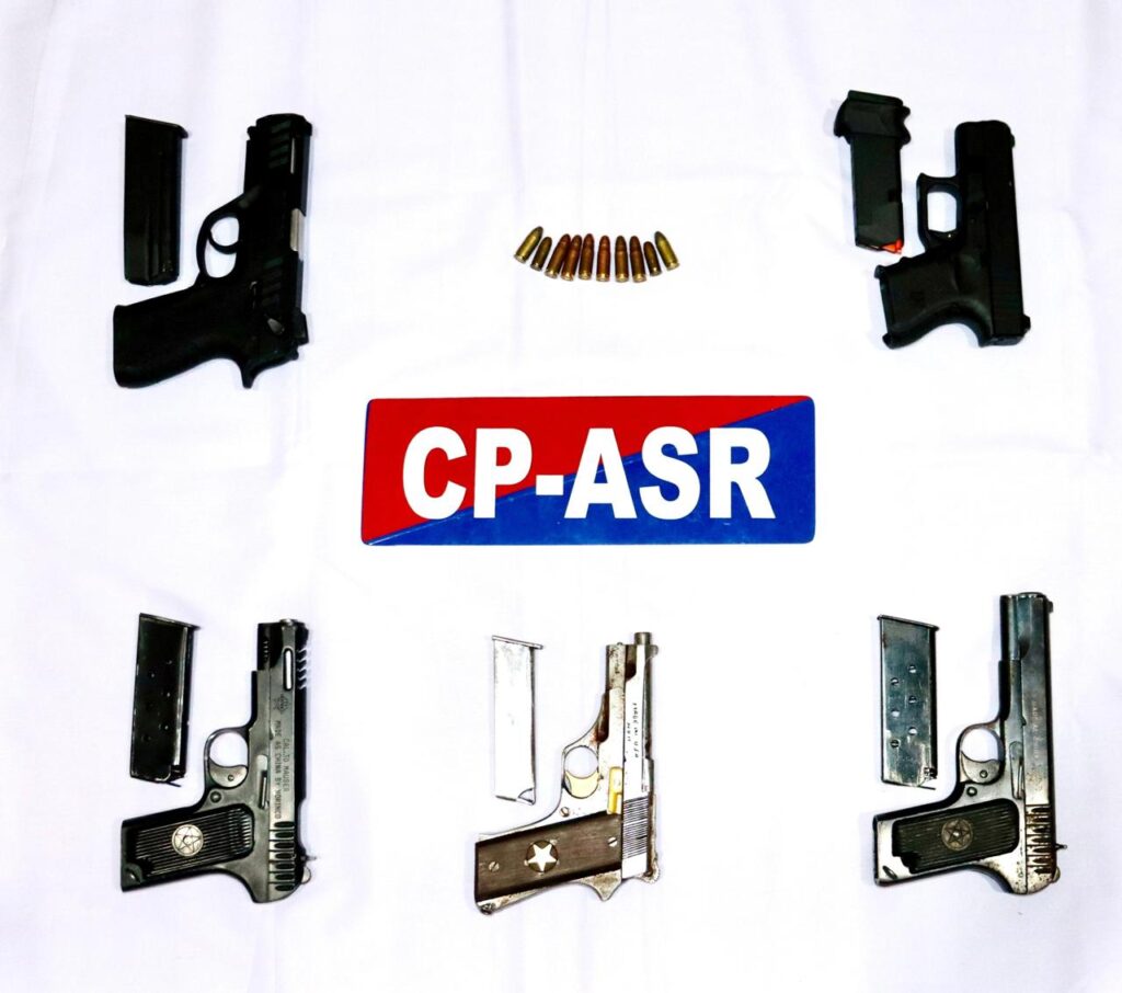 ਕਾਰਵਾਈ ਦੇ ਵੇਰਵੇ ਦਿੰਦਿਆਂ ਪੁਲਿਸ ਕਮਿਸ਼ਨਰ (ਸੀਪੀ) ਅੰਮ੍ਰਿਤਸਰ ਗੁਰਪ੍ਰੀਤ ਸਿੰਘ ਭੁੱਲਰ ਨੇ ਦੱਸਿਆ ਕਿ ਭਰੋਸੇਯੋਗ ਸੂਤਰਾਂ ਤੋਂ ਮਿਲੀ ਗੁਪਤ ਜਾਣਕਾਰੀ ਦੈ ਆਧਾਰ ‘ਤੇ ਕਾਰਵਾਈ ਕਰਦਿਆਂ ਪੁਲਿਸ ਟੀਮਾਂ ਨੇ ਬਾਈਪਾਸ ਰੋਡ ‘ਤੇ ਸਾਡਾ ਪਿੰਡ ਨੇੜੇ ਸੁਚੱਜੇ ਤਾਲਮੇਲ ਨਾਲ ਆਪ੍ਰੇਸ਼ਨ ਚਲਾਇਆ ਅਤੇ ਸ਼ੇਰਾ ਸਿੰਘ ਤੇ ਜਗਰੂਪ ਸਿੰਘ ਉਰਫ਼ ਜੂਪਾ ਨੂੰ ਇੱਕ ਗਲੌਕ ਪਿਸਤੌਲ ਅਤੇ ਇੱਕ .30 ਬੋਰ ਪੀਐਕਸ5 ਸਟੌਰਮ ਪਿਸਤੌਲ ਸਮੇਤ ਗ੍ਰਿਫ਼ਤਾਰ ਕਰ ਲਿਆ। ਉਨ੍ਹਾਂ ਕਿਹਾ ਕਿ ਅਗਲੇਰੀ ਜਾਂਚ ਦੌਰਾਨ ਪੁਲਿਸ ਨੂੰ ਦੋਵੇਂ ਗ੍ਰਿਫ਼ਤਾਰ ਮੁਲਜ਼ਮਾਂ ਵੱਲੋਂ ਕੀਤੇ ਖੁਲਾਸਿਆਂ ਦੇ ਆਧਾਰ ‘ਤੇ ਤਿੰਨ ਹੋਰ ਪਿਸਤੌਲ ਬਰਾਮਦ ਹੋਏ।