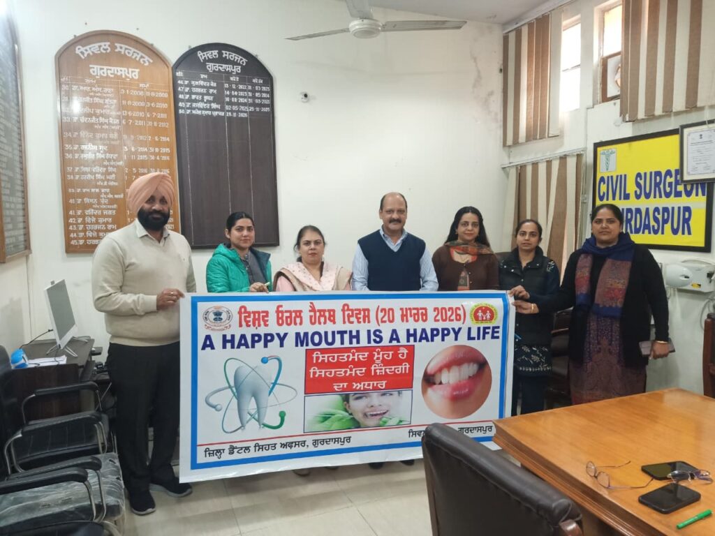 ਗੁਰਦਾਸਪੁਰ, 20 ਮਾਰਚ 2026 (ਮੰਨਨ ਸੈਣੀ)– ਸਿਵਲ ਸਰਜਨ ਗੁਰਦਾਸਪੁਰ ਡਾਕਟਰ ਮਹੇਸ਼ ਕੁਮਾਰ ਪ੍ਰਭਾਕਰ ਜੀ ਦੀ ਅਗੁਵਾਈ ਹੇਠ ਵਰਲਡ ਓਰਲ ਹੈਲਥ ਡੇ 2026 ਮਨਾਓਨ ਸਬੰਧੀ ਪੋਸਟਰ ਦਫਤਰ ਸਿਵਲ ਸਰਜਨ ਵਿਖੇ ਜਾਰੀ ਕੀਤਾ ਗਿਆ। ਜਿਸ ਦਾ Theme ਹੈ “A Happy Mouth is a Happy Life” .ਇਸ ਮੌਕੇ ਡਿਪਟੀ ਡਾਇਰੈਕਟਰ ਕਮ ਡੀ ਡੀ ਐੱਚ ਓ ਡਾਕਟਰ ਵਿਨੋਦ ਭਗਤ ਜੀ ਨੇ ਦੱਸਿਆ ਅੱਜ ਦੁਨੀਆ ਭਰ ਵਿੱਚ 20 ਮਾਰਚ ਨੂੰ ਵਿਸ਼ਵ ਓਰਲ ਹੈਲਥ ਡੇ ਮਨਾਇਆ ਜਾ ਰਿਹਾ ਹੈ। ਇਸ ਦਿਨ ਦਾ ਉਦੇਸ਼ ਲੋਕਾਂ ਵਿੱਚ ਮੂੰਹ ਅਤੇ ਦੰਦਾਂ ਦੀ ਸਿਹਤ ਬਾਰੇ ਜਾਗਰੂਕਤਾ ਫੈਲਾਉਣਾ ਹੈ। ਸਿਹਤਮੰਦ ਦੰਦ ਅਤੇ ਮੂੰਹ ਸਿਰਫ਼ ਸੁੰਦਰ ਮੁਸਕਾਨ ਲਈ ਹੀ ਨਹੀਂ, ਸਗੋਂ ਸਮੁੱਚੀ ਸਿਹਤ ਲਈ ਵੀ ਬਹੁਤ ਜ਼ਰੂਰੀ ਹਨ। ਦੰਦਾ ਪ੍ਰਤੀ ਇੱਕ ਮਹੀਨਾ ਜਾਗਰੂਕ ਕਰਨ ਲਈ ਵੱਖ ਵੱਖ ਗਤੀਵਿਧੀਆ ਕੀਤੀਆ ਜਾਣਿਆ ਹੈ ਜਿਵੇ ਕਿ ਪੋਸਟਰ ਮੇਕਿੰਗ ਮੁਕਾਬਲਾ, ਰੰਗੋਲੀ ਮੁਕਾਬਲਾ ਅਤੇ ਵੱਖ ਵੱਖ ਕੈਂਪ ਆਯੋਜਿਤ ਕੀਤੇ ਜਾਣਗੇ। ਓਹਨਾ ਦਸਿਆ ਕਿ ਹਰ ਛੇ ਮਹੀਨੇ ਬਾਦ ਡਾਕਟਰ ਤੋਂ ਚੈਕ ਅੱਪ ਆਪਣੇ ਨੇੜਲੇ ਸਰਕਾਰੀ ਸੰਸਥਾ ਕਰਵਾਣਾ ਚਾਹੀਦਾ ਹੈ। ਜੇਕਰ ਸਾਡਾ ਮੂੰਹ ਸਵਸਥ ਹੈ ਤਾਂ ਸਾਡੀ ਜਿੰਦਗੀ ਭੀ ਖੁਸ਼ਹਾਲ ਹੈ।