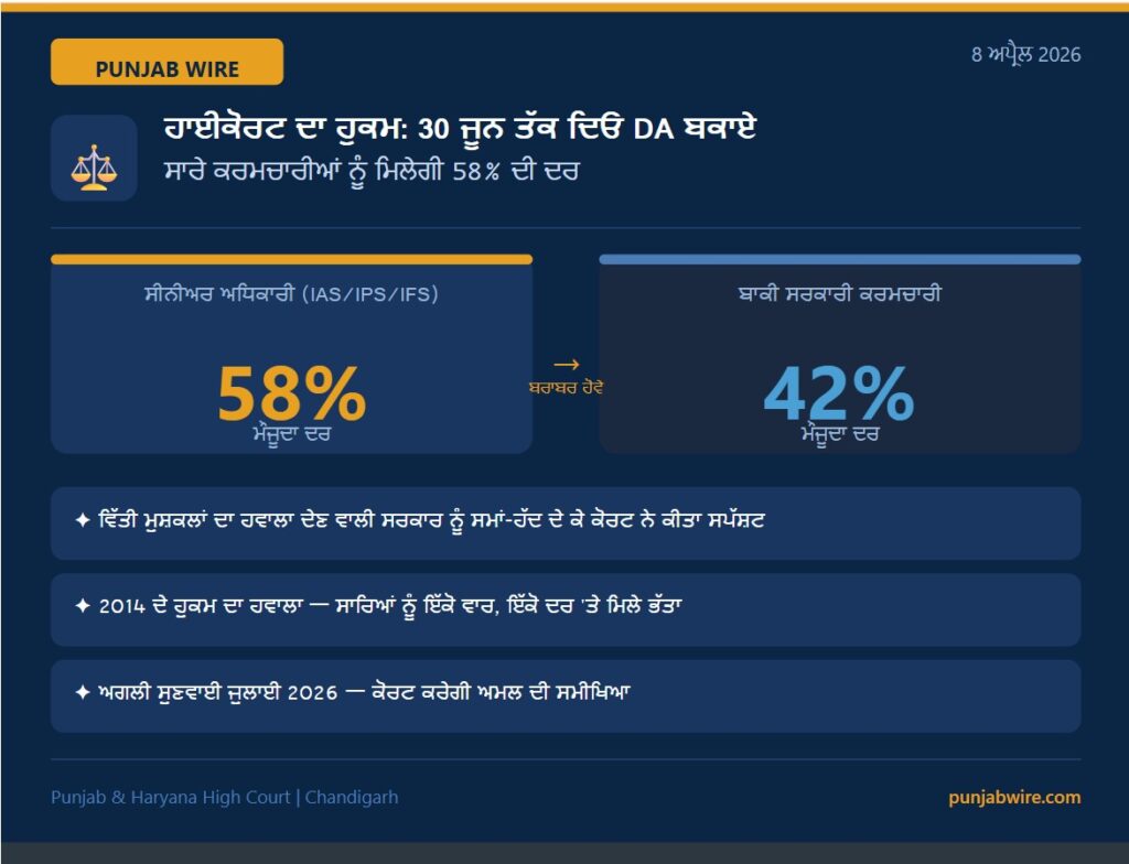 ਚੰਡੀਗੜ੍ਹ, 8 ਅਪ੍ਰੈਲ 2026 (ਦੀ ਪੰਜਾਬ ਵਾਇਰ)। ਪੰਜਾਬ ਅਤੇ ਹਰਿਆਣਾ ਹਾਈਕੋਰਟ ਨੇ ਪੰਜਾਬ ਸਰਕਾਰ ਨੂੰ ਸਖ਼ਤ ਹਦਾਇਤ ਦਿੱਤੀ ਹੈ ਕਿ ਸਾਰੇ ਸਰਕਾਰੀ ਕਰਮਚਾਰੀਆਂ ਅਤੇ ਪੈਨਸ਼ਨਰਾਂ ਦੇ ਮਹਿੰਗਾਈ ਭੱਤੇ (DA) ਦੇ ਪੂਰੇ ਬਕਾਏ 30 ਜੂਨ 2026 ਤੱਕ ਅਦਾ ਕੀਤੇ ਜਾਣ। ਕੋਰਟ ਨੇ ਇਹ ਵੀ ਕਿਹਾ ਕਿ ਮਹਿੰਗਾਈ ਭੱਤਾ ਸਾਰੇ ਵਰਗਾਂ ਦੇ ਕਰਮਚਾਰੀਆਂ ਨੂੰ ਇੱਕੋ ਦਰ ‘ਤੇ ਮਿਲਣਾ ਚਾਹੀਦਾ ਹੈ।