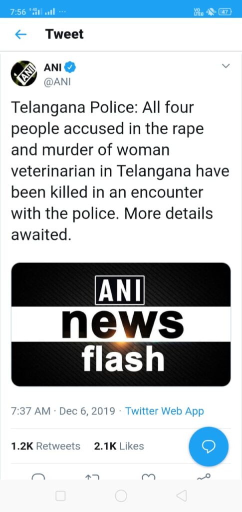 तेलंगाना में रेप कांड के चारों आरोपियों का एन्काउंटर कर दिया गया है. यह खबर न्यूज एजेंसी ANI के हवाले से है. इन चारों आरोपियों पर महिला वेटेरनरी डॉक्टर के साथ रेप का आरोप है. पुलिस का दावा है कि ये सभी आरोपी भागने की कोशिश कर रहे थे और इस दौरान पुलिस की ओर से हुई फायरिंग में सभी आरोपी मारे गए हैं.