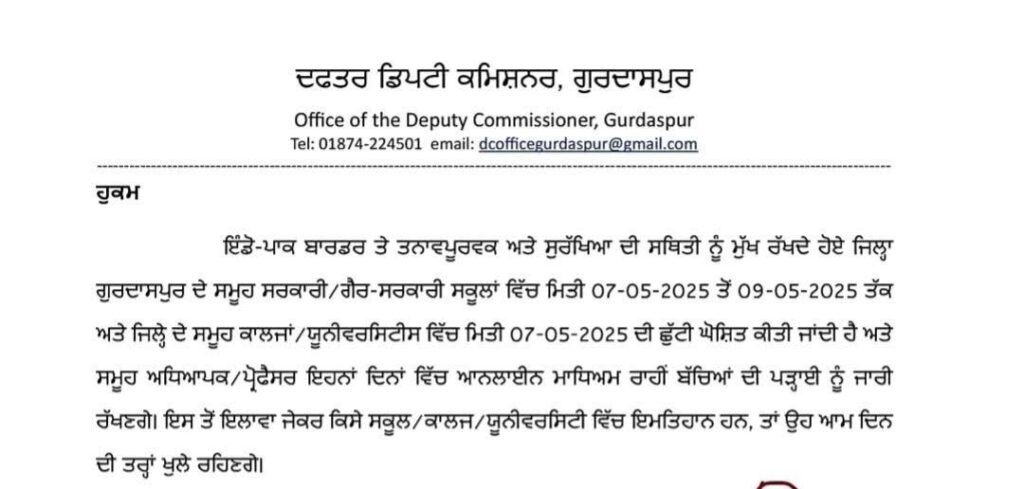 ਗੁਰਦਾਸਪੁਰ ਜਿਲ੍ਹੇ ਅੰਦਰ 9 ਮਈ ਤੱਕ ਸਕੂਲਾਂ ਅੰਦਰ ਪਇਆਂ ਛੁੁੱਟਿਆਂ, ਪੜੋ ਆਰਡਰ