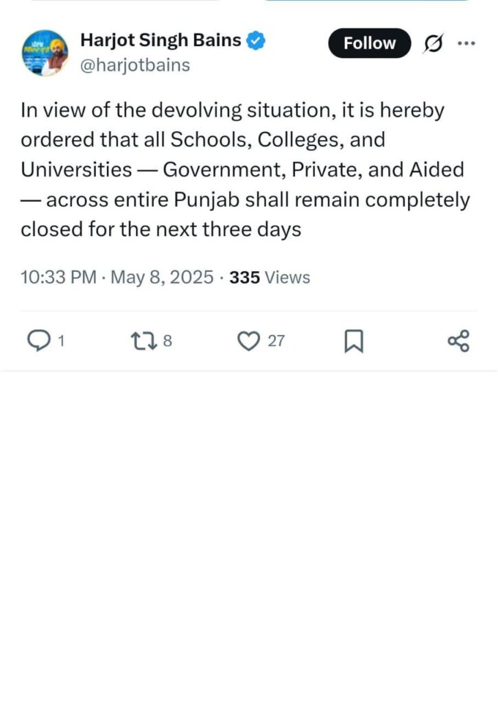 ਚੰਡੀਗੜ੍ਹ, 8 ਮਈ 2025 (ਦੀ ਪੰਜਾਬ ਵਾਇਰ)। ਪੰਜਾਬ ਵਿੱਚ ਬਦਲ ਰਹੀ ਸਥਿਤੀ ਨੂੰ ਦੇਖਦੇ ਹੋਏ ਸਿੱਖਿਆ ਮੰਤਰੀ ਹਰਜੋਤ ਸਿੰਘ ਬੈਂਸ ਨੇ ਐਲਾਨ ਕੀਤਾ ਹੈ ਕਿ ਰਾਜ ਦੀਆਂ ਸਾਰੀਆਂ ਸਕੂਲਾਂ, ਕਾਲਜਾਂ ਅਤੇ ਯੂਨੀਵਰਸਿਟੀਆਂ — ਸਰਕਾਰੀ, ਪ੍ਰਾਈਵੇਟ ਅਤੇ ਐਡਿਡ — ਪੂਰੀ ਤਰ੍ਹਾਂ ਤਿੰਨ ਦਿਨਾਂ ਲਈ ਬੰਦ ਰਹਿਣਗੀਆਂ।