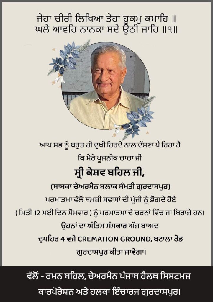 ਸ਼੍ਰੀ ਕੇਸ਼ਵ ਬਹਿਲ ਜੀ ਦੀਆਂ ਅੰਤਿਮ ਸੰਸਕਾਰ ਦੀਆਂ ਰਸਮਾਂ ਅੱਜ ਦੁਪਹਿਰ 4 ਵਜੇ Cremation Ground ਬਟਾਲਾ ਰੋਡ, ਗੁਰਦਾਸਪੁਰ ਵਿਖੇ ਕੀਤੀਆਂ ਜਾਣਗੀਆਂ।