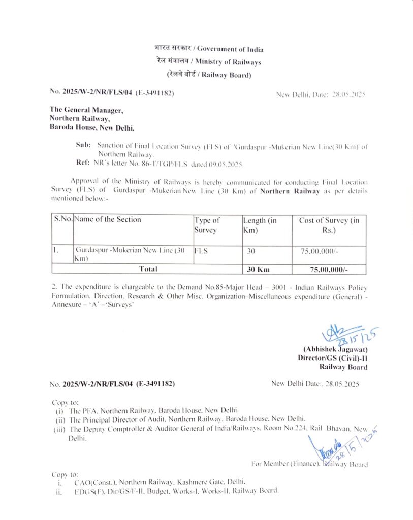 ਚੰਗੀ ਖ਼ਬਰ -ਦੀ ਪੰਜਾਬ ਵਾਇਰ ਦੀ ਖ਼ਬਰ ਦਾ ਹੋਇਆ ਅਸਰ, ਗੁਰਦਾਸਪੁਰ ਮੁਕੇਰਿਆਂ ਰੇਲ ਲਾਈਨ ਲਈ ਅੰਤਿਮ ਜ਼ਮੀਨੀ ਸਰਵੇ ਨੂੰ ਮਿਲੀ ਮਨਜ਼ੂਰੀ