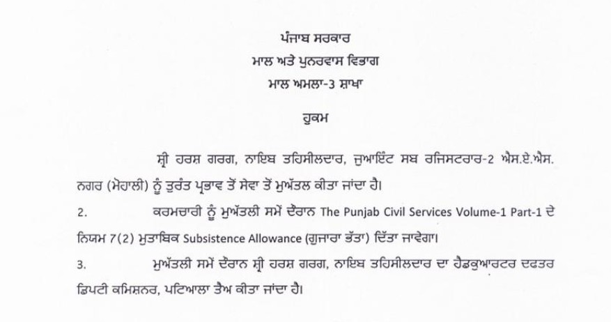 ਪੰਜਾਬ ਐਸ.ਏ.ਐਸ ਨਗਰ (ਮੋਹਾਲੀ) ਤਾਇਨਾਤ ਨਾਇਬ ਤਹਿਸੀਲਦਾਰ, ਜੁਆਇੰਟ ਸਬ ਰਜਿਸਟਰਾਰ-2 ਮੁਅੱਤਲ ByThe Punjab Wire PublishedJuly 21, 2025 ਚੰਡੀਗੜ੍ਹ, 21 ਜੁਲਾਈ 2025 (ਦੀ ਪੰਜਾਬ ਵਾਇਰ)। ਪੰਜਾਬ ਸਰਕਾਰ ਵੱਲੋਂ ਐਸ.ਏ.ਐਸ ਨਗਰ (ਮੋਹਾਲੀ) ਤਾਇਨਾਤ ਨਾਇਬ ਤਹਿਸੀਲਦਾਰ, ਜੁਆਇੰਟ ਸਬ ਰਜਿਸਟਰਾਰ-2 ਹਰੀਸ਼ ਗਰਗ ਨੂੰ ਮੁਅੱਤਲ ਕਰ ਦਿੱਤਾ ਗਿਆ ਹੈ। ਇਸ ਸਮੇਂ ਦੌਰਾਨ ਉਨ੍ਹਾਂ ਦਾ ਹੈਡਕੁਆਰਟਰ ਡਿਪਟੀ ਕਮਿਸ਼ਨਰ ਪਟਿਆਲਾ ਤੈਅ ਕੀਤਾ ਗਿਆ ਹੈ। Facebook Twitter WhatsApp Messenger Email Print
