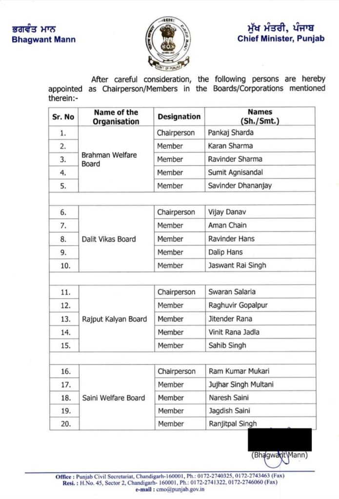ਚੰਡੀਗੜ੍ਹ, 8 ਅਗਸਤ 2025 (ਦੀ ਪੰਜਾਬ ਵਾਇਰ)। ਮੁੱਖ ਮੰਤਰੀ ਭਗਵੰਤ ਮਾਨ ਵੱਲੋਂ ਰਾਜ ਦੇ ਵੱਖ-ਵੱਖ ਵਰਗਾਂ ਦੇ ਬੋਰਡਾਂ/ਕਾਰਪੋਰੇਸ਼ਨਾਂ ਦੇ ਚੇਅਰਪਰਸਨਾਂ ਅਤੇ ਮੈਂਬਰਾਂ ਦੀ ਨਿਯੁਕਤੀ ਕਰ ਦਿੱਤੀ ਗਈ ਹੈ। ਜਿਸ ਦੇ ਚਲਦੇ ਉਨ੍ਹਾਂ ਵੱਲੋਂ ਸਾਰਿਆਂ ਨੂੰ ਨਵੀਆਂ ਜ਼ਿੰਮੇਵਾਰੀਆਂ ਲਈ ਦਿਲੋਂ ਬਹੁਤ-ਬਹੁਤ ਸ਼ੁਭਕਾਮਨਾਵਾਂ ਦਿੱਤੀਆਂ ਗਈਆ ਹਨ। ਮੁੱਖ ਮੰਤਰੀ ਨੇ ਉਮੀਦ ਜਤਾਈ ਕਿ ਸਾਰੇ ਸਾਥੀ ਆਪਣੀਆਂ ਜ਼ਿੰਮੇਵਾਰੀਆਂ ਸਮਾਜ ਦੀ ਭਲਾਈ ਅਤੇ ਪੰਜਾਬ ਦੀ ਤਰੱਕੀ ਲਈ ਪੂਰੀ ਤਨਦੇਹੀ ਨਾਲ ਨਿਭਾਉਣਗੇ