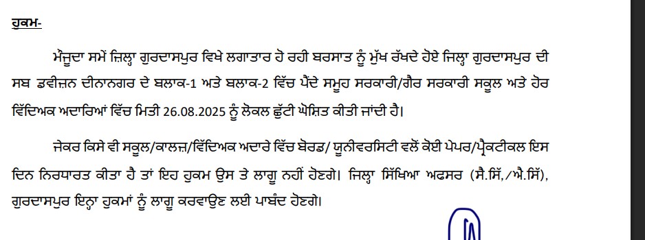 ਗੁਰਦਾਸਪੁਰ, 25 ਅਗਸਤ (ਮੰਨਨ ਸੈਣੀ)। ਮੌਜੂਦਾ ਸਮੇਂ ਜ਼ਿਲ੍ਹਾ ਗੁਰਦਾਸਪੁਰ ਵਿਖੇ ਲਗਾਤਾਰ ਹੋ ਰਹੀ ਬਰਸਾਤ ਨੂੰ ਮੁੱਖ ਰੱਖਦੇ ਹੋਏ ਜਿਲ੍ਹਾ ਗੁਰਦਾਸਪੁਰ ਦੀ ਸਬ ਡਵੀਜ਼ਨ ਦੀਨਾਨਗਰ ਦੇ ਬਲਾਕ-1 ਅਤੇ ਬਲਾਕ-2 ਵਿੱਚ ਪੈਂਦੇ ਸਮੂਹ ਸਰਕਾਰੀ/ਗੈਰ ਸਰਕਾਰੀ ਸਕੂਲ ਅਤੇ ਹੋਰ ਵਿੱਦਿਅਕ ਅਦਾਰਿਆਂ ਵਿੱਚ ਮਿਤੀ 26.08.2025 ਨੂੰ ਲੋਕਲ ਛੁੱਟੀ ਘੋਸ਼ਿਤ ਕੀਤੀ ਜਾਂਦੀ ਹੈ। ਇਹ ਆਦੇਸ਼ ਗੁਰਦਾਸਪੁਰ ਦੇ ਵਧੀਕ ਜ਼ਿਲ੍ਹਾ ਮੈਜਿਸਟ੍ਰੇਟ ਵੱਲੋਂ ਜਾਰੀ ਕਰ ਦਿੱਤਾ ਗਿਆ ਹੈ।