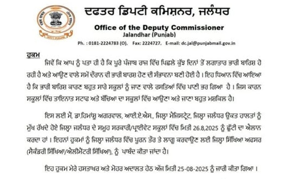 ਜਲੰਧਰ, 25 ਅਗਸਤ 2025 (ਦੀ ਪੰਜਾਬ ਵਾਇਰ)। ਜ਼ਿਲ੍ਹੇ ਵਿੱਚ ਪਿਛਲੇ ਕਈ ਦਿਨਾਂ ਤੋਂ ਹੋ ਰਹੀ ਲਗਾਤਾਰ ਬਾਰਿਸ਼ ਦੇ ਮੱਦੇਨਜ਼ਰ, ਜਲੰਧਰ ਦੇ ਜ਼ਿਲ੍ਹਾ ਮੈਜਿਸਟ੍ਰੇਟ ਡਾ. ਹਿਮਾਂਸ਼ੂ ਅਗਰਵਾਲ ਨੇ ਇੱਕ ਅਹਿਮ ਫੈਸਲਾ ਲਿਆ ਹੈ। ਬੱਚਿਆਂ ਅਤੇ ਸਟਾਫ਼ ਦੀ ਸੁਰੱਖਿਆ ਨੂੰ ਯਕੀਨੀ ਬਣਾਉਣ ਲਈ, ਉਨ੍ਹਾਂ ਨੇ 26 ਅਗਸਤ, 2025 ਨੂੰ ਜ਼ਿਲ੍ਹੇ ਦੇ ਸਾਰੇ ਸਰਕਾਰੀ ਅਤੇ ਪ੍ਰਾਈਵੇਟ ਸਕੂਲਾਂ ਵਿੱਚ ਛੁੱਟੀ ਦਾ ਐਲਾਨ ਕੀਤਾ ਹੈ।