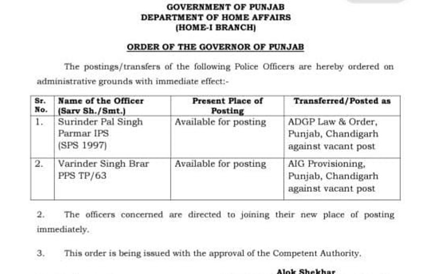 ਚੰਡੀਗੜ੍ਹ, 27 ਅਗਸਤ 2025 (ਦੀ ਪੰਜਾਬ ਵਾਇਰ)। ਪੰਜਾਬ ਸਰਕਾਰ ਵੱਲੋਂ ਦੋ ਆਈ.ਪੀ.ਐਸ ਅਧਿਕਾਰੀਆਂ ਦੀਆਂ ਤਾਇਨਾਤੀਆਂ ਕਰ ਦਿੱਤੀਆਂ ਗਈਆ ਹਨ। ਜਿਸ ਦੀ ਸੂਚੀ ਹੇਂਠ ਦਿੱਤੀ ਗਈ ਹੈ।