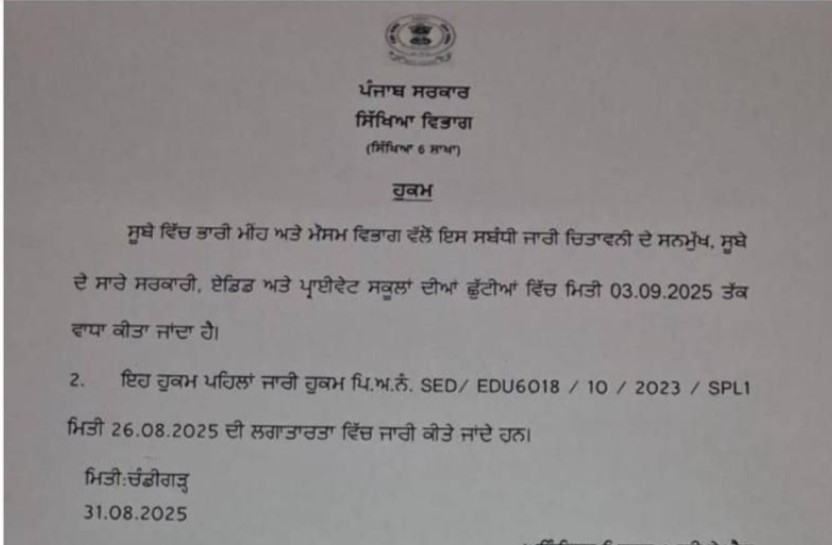 ਚੰਡੀਗੜ੍ਹ, 31 ਅਗਸਤ 2025 (ਦੀ ਪੰਜਾਬ ਵਾਇਰ) ਸੂਬੇ ਵਿੱਚ ਭਾਰੀ ਮੀਂਹ ਅਤੇ ਮੌਸਮ ਵਿਭਾਗ ਵੱਲੋਂ ਇਸ ਸੰਬੰਧੀ ਜਾਰੀ ਚਿਤਾਵਨੀ ਦੇ ਸਨਮੁੱਖ ਸੂਬੇ ਦੇ ਸਾਰੇ ਸਰਕਾਰੀ, ਏਡਿਡ ਅਤੇ ਪ੍ਰਾਈਵੇਟ ਸਕੂਲਾਂ ਦੀਆਂ ਛੁੱਟੀਆਂ ਵਿੱਚ 3-9-2025 ਤੱਕ ਵਾਧਾ ਕੀਤਾ ਗਿਆ ਹੈ