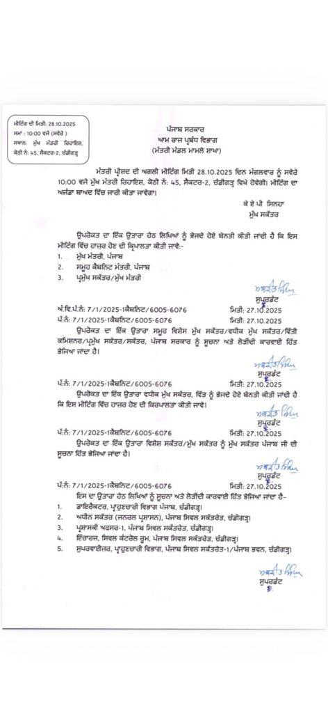 ਚੰਡੀਗੜ੍ਹ, 27 ਅਕਤੂਬਰ 2025 (ਦੀ ਪੰਜਾਬ ਵਾਇਰ)। ਮੁੱਖ ਮੰਤਰੀ ਭਗਵੰਤ ਮਾਨ ਨੇ 28 ਅਕਤੂਬਰ ਨੂੰ ਸਵੇਰੇ 10 ਵਜੇ ਮੁੱਖ ਮੰਤਰੀ ਨਿਵਾਸ ਵਿਖੇ ਕੈਬਨਿਟ ਮੀਟਿੰਗ ਬੁਲਾਈ ਹੈ। ਮੀਟਿੰਗ ਵਿੱਚ ਸ਼ਹੀਦੀ ਦਿਵਸ ਨੂੰ ਵੱਡੇ ਪੱਧਰ ‘ਤੇ ਮਨਾਉਣ ਲਈ ਮਹੱਤਵਪੂਰਨ ਪ੍ਰਸਤਾਵਾਂ ਅਤੇ ਸ੍ਰੀ ਆਨੰਦਪੁਰ ਸਾਹਿਬ ਵਿੱਚ ਵਿਸ਼ੇਸ਼ ਵਿਧਾਨ ਸਭਾ ਸੈਸ਼ਨ ਬੁਲਾਉਣ ਨੂੰ ਮਨਜ਼ੂਰੀ ਦਿੱਤੀ ਜਾ ਸਕਦੀ ਹੈ।