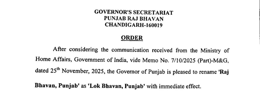 ਚੰਡੀਗੜ੍ਹ, 4 ਦਿਸੰਬਰ 2025 (ਦੀ ਪੰਜਾਬ ਵਾਇਰ)। ਪੰਜਾਬ ਦੇ ਰਾਜਪਾਲ ਦੇ ਦਫ਼ਤਰ (ਗਵਰਨਰ ਸਕੱਤਰੇਤ) ਵੱਲੋਂ ਇੱਕ ਅਹਿਮ ਹੁਕਮ ਜਾਰੀ ਕਰਦਿਆਂ ‘ਪੰਜਾਬ ਰਾਜ ਭਵਨ’ ਦਾ ਨਾਮ ਤਬਦੀਲ ਕਰ ਦਿੱਤਾ ਗਿਆ ਹੈ। ਜਾਰੀ ਕੀਤੇ ਗਏ ਨਵੇਂ ਹੁਕਮਾਂ ਮੁਤਾਬਕ ਹੁਣ ਇਸਨੂੰ ‘ਲੋਕ ਭਵਨ, ਪੰਜਾਬ’ ਦੇ ਨਾਮ ਨਾਲ ਜਾਣਿਆ ਜਾਵੇਗਾ।