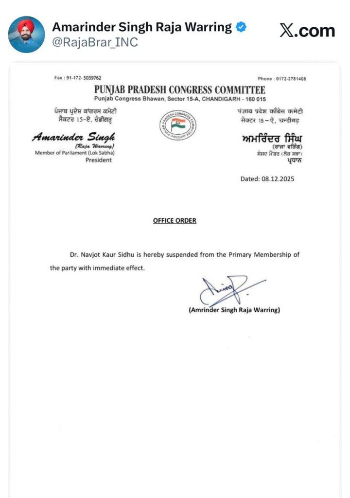 ਚੰਡੀਗੜ੍ਹ, 8 ਦਿਸੰਬਰ 2025 (ਦੀ ਪੰਜਾਬ ਵਾਇਰ)। ਪੰਜਾਬ ਪ੍ਰਦੇਸ਼ ਕਾਂਗਰਸ ਕਮੇਟੀ (PPCC) ਵੱਲੋਂ ਜਾਰੀ ਕੀਤੇ ਗਏ ਇੱਕ ‘ਆਫਿਸ ਆਰਡਰ’ ਰਾਹੀਂ ਡਾਕਟਰ ਨਵਜੋਤ ਕੌਰ ਸਿੱਧੂ ਨੂੰ ਪਾਰਟੀ ਦੀ ਮੁੱਢਲੀ ਮੈਂਬਰਸ਼ਿਪ ਤੋਂ ਤੁਰੰਤ ਪ੍ਰਭਾਵ ਨਾਲ ਮੁਅੱਤਲ ਕਰ ਦਿੱਤਾ ਗਿਆ ਹੈ।