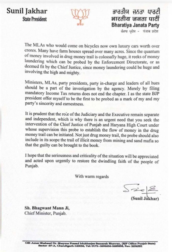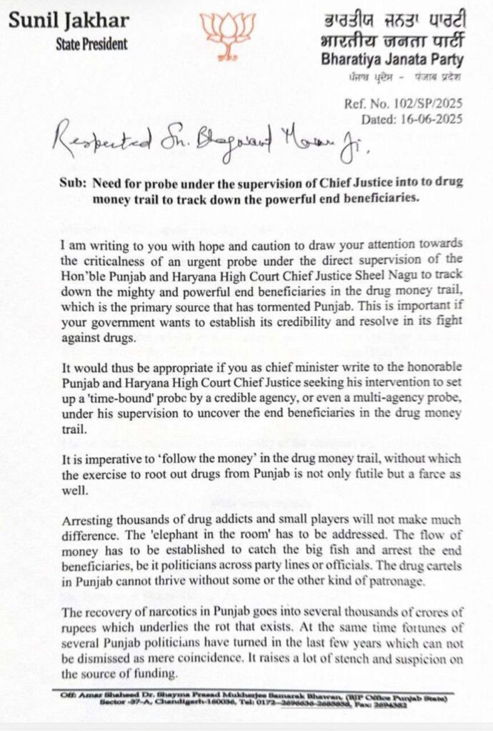 ਚੰਡੀਗੜ੍ਹ, 9 ਦਿਸੰਬਰ 2025 (ਦੀ ਪੰਜਾਬ ਵਾਇਰ)। ਪੰਜਾਬ ਭਾਜਪਾ ਦੇ ਪ੍ਰਧਾਨ ਸੁਨੀਲ ਜਾਖੜ ਨੇ ਸੂਬੇ ਵਿੱਚ ਭ੍ਰਿਸ਼ਟਾਚਾਰ ਅਤੇ ਨਸ਼ਿਆਂ ਦੇ ਮਾਮਲੇ ‘ਤੇ ਮੁੱਖ ਮੰਤਰੀ ਭਗਵੰਤ ਮਾਨ ‘ਤੇ ਦਬਾਅ ਵਧਾਉਂਦੇ ਹੋਏ ਇੱਕ ਵਾਰ ਫਿਰ ਵੱਡਾ ਬਿਆਨ ਦਿੱਤਾ ਹੈ। 6 ਜੂਨ 2025 ਨੂੰ ਡਰੱਗ ਮਨੀ ਟ੍ਰੇਲ ਦੀ ਜਾਂਚ ਲਈ ਲਿਖੇ ਆਪਣੇ ਪੁਰਾਣੇ ਪੱਤਰ ਨੂੰ ਸੋਸ਼ਲ ਮੀਡੀਆ ‘ਤੇ ਸਾਂਝਾ ਕਰਦੇ ਹੋਏ, ਜਾਖੜ ਨੇ ਹਾਈਕੋਰਟ ਦੇ ਮਾਨਯੋਗ ਚੀਫ ਜਸਟਿਸ ਦੀ ਨਿਗਰਾਨੀ ਹੇਠ ਸਮਾਂਬੱਧ ਜਾਂਚ ਦੀ ਮੰਗ ਨੂੰ ਦੁਹਰਾਇਆ ਹੈ।