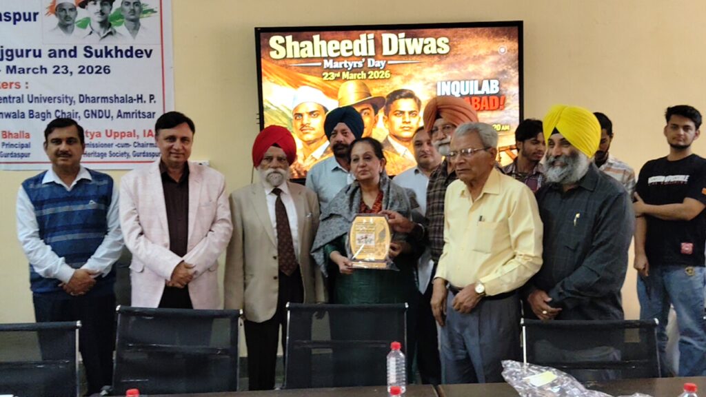 ਗੁਰਦਾਸਪੁਰ, 23 ਮਾਰਚ 2026 (ਮੰਨਣ ਸੈਣੀ)।ਸਰਕਾਰੀ ਕਾਲਜ ਗੁਰਦਾਸਪੁਰ ਵੱਲੋਂ ਅੱਜ ਸ਼ਹੀਦੇ ਆਜ਼ਮ ਭਗਤ ਸਿੰਘ, ਰਾਜਗੁਰੂ ਅਤੇ ਸੁਖਦੇਵ ਦੇ ਸ਼ਹੀਦੀ ਦਿਵਸ ਨੂੰ ਬੜੀ ਸ਼ਰਧਾ ਅਤੇ ਦੇਸ਼ਭਗਤੀ ਭਾਵਨਾ ਨਾਲ ਮਨਾਇਆ ਗਿਆ। ਇਸ ਸਮਾਗਮ ਦਾ ਆਯੋਜਨ ਜ਼ਿਲ੍ਹਾ ਹੈਰੀਟੇਜ ਸੋਸਾਇਟੀ ਗੁਰਦਾਸਪੁਰ ਜਿਸ ਦੇ ਪ੍ਰਧਾਨ ਡਿਪਟੀ ਕਮਿਸ਼ਨਰ ਗੁਰਦਾਸਪੁਰ ਅਤੇ ਸਕੱਤਰ ਪ੍ਰੋ. ਰਾਜ ਕੁਮਾਰ ਸ਼ਰਮਾ ਹਨ ਦੇ ਸਹਿਯੋਗ ਨਾਲ ਸਰਕਾਰੀ ਕਾਲਜ ਗੁਰਦਾਸਪੁਰ ਦੇ ਪ੍ਰੰਗਣ ਵਿੱਚ ਕੀਤਾ ਗਿਆ। ਇਸ ਮੌਕੇ ਜ਼ਿਲ੍ਹਾ ਹੈਰਿਟੇਜ ਸੋਸਾਇਟੀ ਦੇ ਮੈਂਬਰ ਸਾਹਿਬਾਨ ਵੀ ਵਿਸ਼ੇਸ਼ ਤੌਰ ‘ਤੇ ਹਾਜ਼ਰ ਰਹੇ।