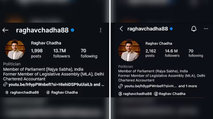 ਨਵੀਂ ਦਿੱਲੀ, 25 ਅਪ੍ਰੈਲ 2026 (ਦੀ ਪੰਜਾਬ ਵਾਇਰ)। AAP ਛੱਡ ਕੇ ਭਾਜਪਾ ਵਿੱਚ ਸ਼ਾਮਲ ਹੋਣ ਦੇ ਮਹਿਜ਼ 24 ਘੰਟਿਆਂ ਦੇ ਅੰਦਰ ਰਾਜ ਸਭਾ ਮੈਂਬਰ ਰਾਘਵ ਚੱਢਾ ਦੇ ਇੰਸਟਾਗ੍ਰਾਮ ਉੱਤੇ ਕਰੀਬ 10 ਲੱਖ ਫ਼ੌਲੋਅਰ ਘੱਟ ਗਏ। ਸ਼ੁੱਕਰਵਾਰ ਨੂੰ ਜਿੱਥੇ ਉਨ੍ਹਾਂ ਦੇ 1 ਕਰੋੜ 46 ਲੱਖ ਫ਼ੌਲੋਅਰ ਸਨ, ਉੱਥੇ ਸ਼ਨੀਵਾਰ ਦੁਪਹਿਰ ਇੱਕ ਵਜੇ ਤੱਕ ਇਹ ਗਿਣਤੀ ਘਟ ਕੇ 1 ਕਰੋੜ 35 ਲੱਖ ਰਹਿ ਗਈ।